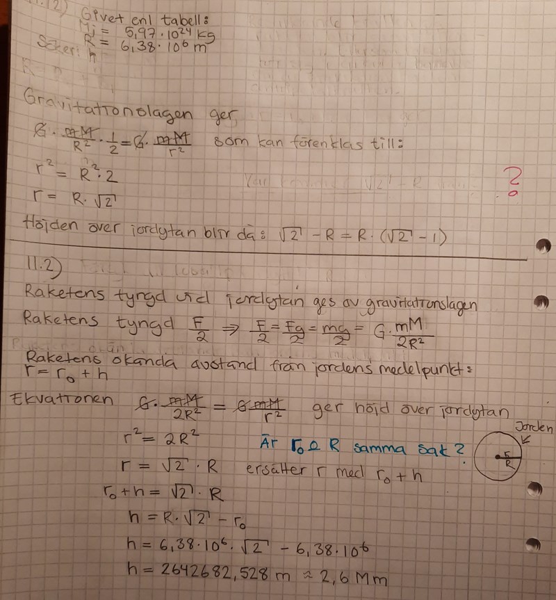 r består av jordens radie och höjden, varav höjden är den okända delen i avståndet till raketen så det var det jag syftade på. Om det var mitt ordval så kanske jag borde ha skrivit lite luddigt. Tror inte jag kommer längre än så är med mina övriga frågor. Fortsätter diskussionen med lärarna i skolan.