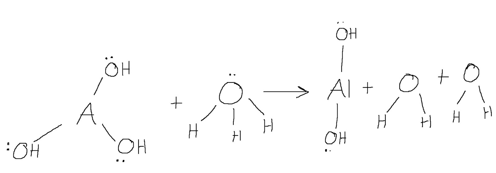 Enligt författaren agerar aluminiumhydroxiden här som lewisbas, alltså donerar den (tre?) elektronpar till oxoniumjonerna, ett elektronpar till varje oxoniumjon. Jag har försökt rita ut reaktionen men jag förstår inte riktigt hur det bara är ett elektronpar som doneras, det verkar ju som om hela hydroxigrupper doneras: