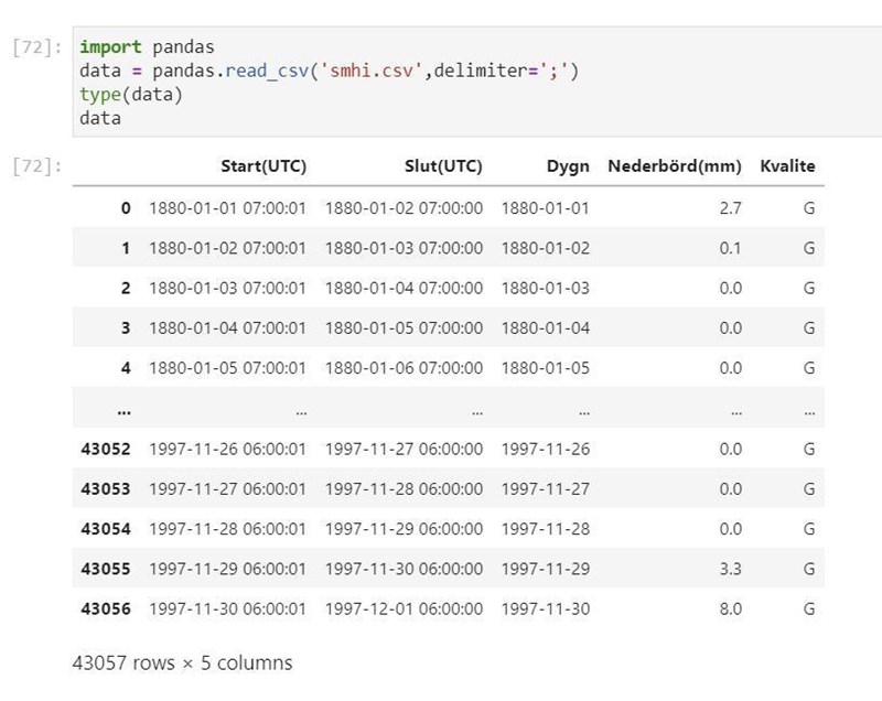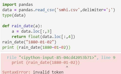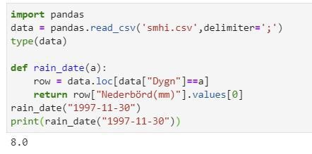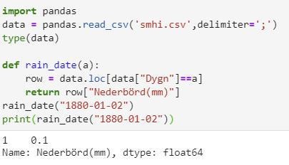 Jag måste alltså importera datan från csv filen först. Men hur kodar jag så att datumet jag anger ger tillbaka motsvarande data för regnfall? Några tips? Jag har ju som ni ser försökt med a som funktionsvariabel och sedan länka a till att det ska vara raden "Dygn" som anges i värden men tydligen funkar inte det.