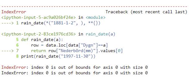 Hej, min uppgift är att skapa en funktion som via ett datum som argument returnerar motsvarande regnvärde.