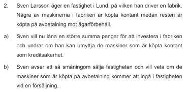 a) Dessa maskiner kommer klassificeras som fastighetstillbehör enligt 2 kap 3 § och alltså kan Sven belåna fastigheten då dessa räknas med i värdet av fastigheten och blir en kreditsäkerhet.