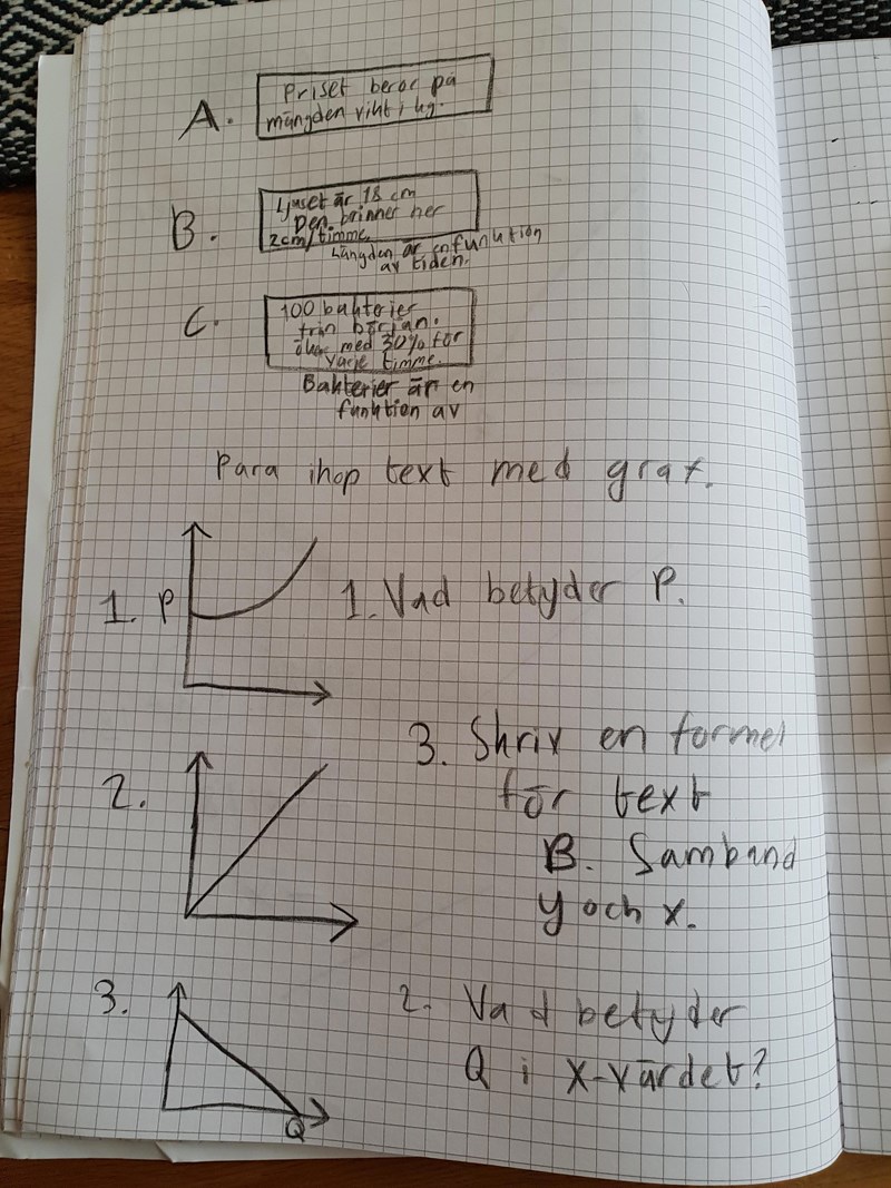 Hej behöver hjälp med den här det kom på mitt läxförhör och har redan haft det undrar bara om jag gjort rätt jag vet inte om jag gjort rätt jag försökte och skrev att A passar ihop med graf 2. B passar ihop med graf 3 och C passar ihop med graf 1. Jag skrev att P står för 100 bakterier. 2. Q står för 9. 3. En formel är y=18-2x