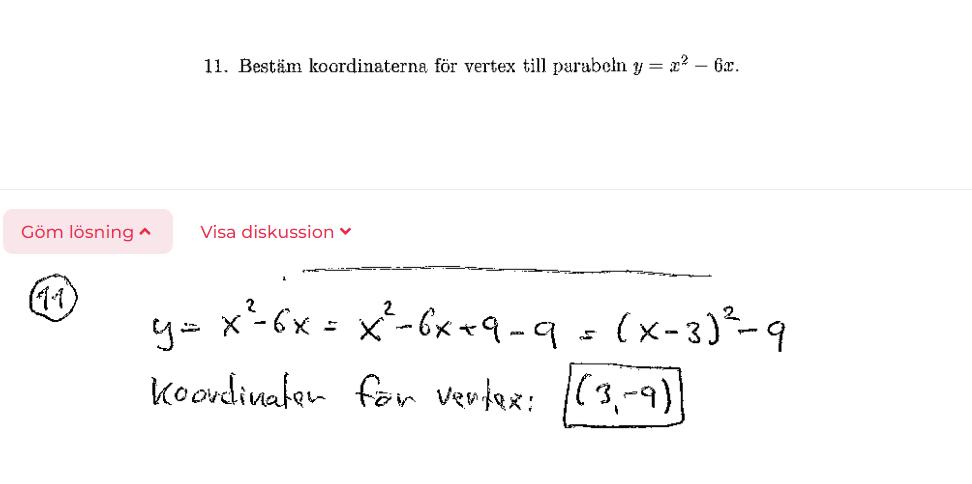 Man kvadratkompletterar. (x-3)2=x2-6x+9(x-3)^2=x^2-6x+9 men nu har vi helt plöstligt ändrat på ekvationen eftersom vi adderat 9, så vi subtraherar 9 så har vi ju likhet: