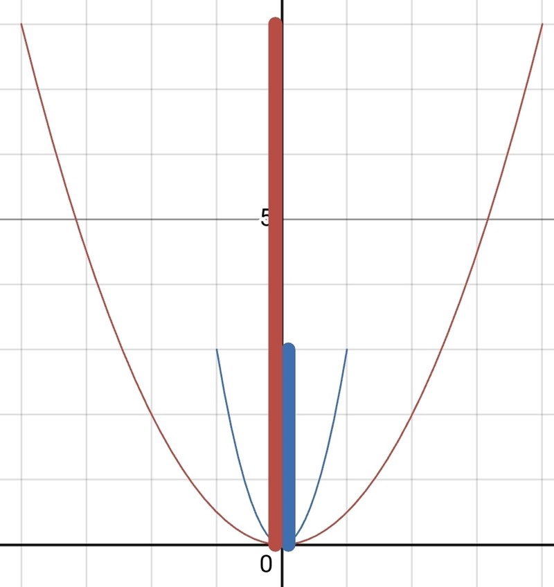 Då visste jag att y växer mer och mer ju längre bort man kommer från symmetrilinjen (som i båda fallen är x = 0). Då inser jag att y i A går mot 0,5*42 = 8 då x går mot 4 och mot 0,5*(-4)2 = 8 då x går mot -4.
