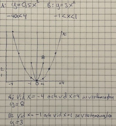 A:  y=0.5x2, -4<x<4,  Värdemängd: [0,8)A: \quad y = 0.5x^2, \; -4 < x < 4, \quad \text{Värdemängd: } [0, 8)