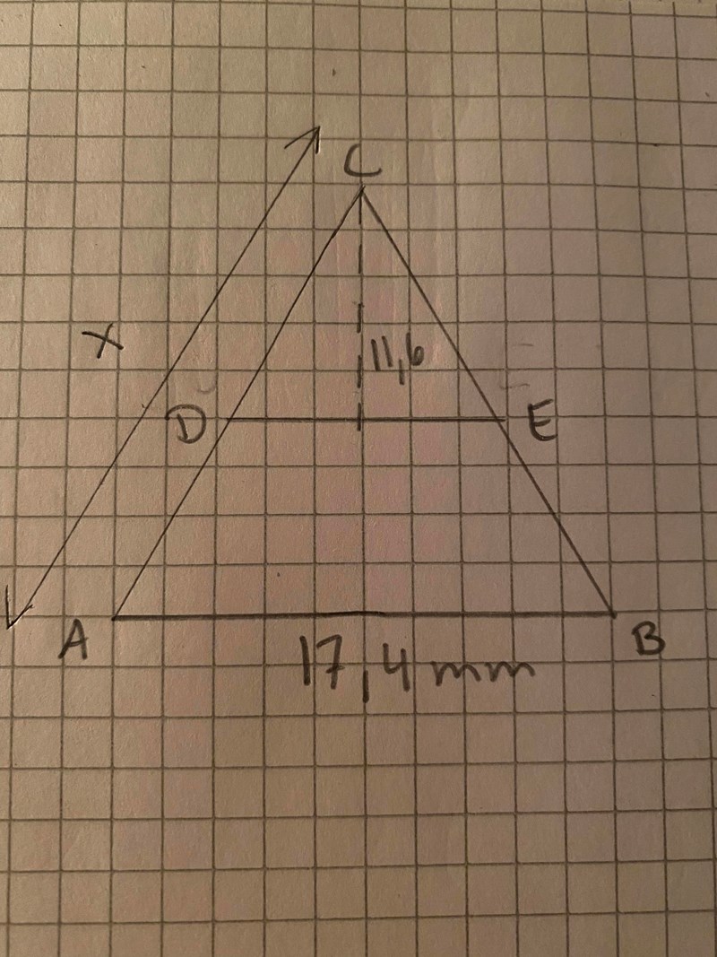 Triangeln ABC är likbent. Basen AB är 17,4mm. En parallelltransversal DE delar triangelns lika långa sidor i förhållandet 5:3 (AD:DC). Höjden i topptriangeln är 11,6 mm. Bestäm sidan AC.