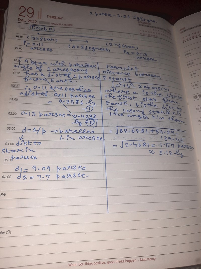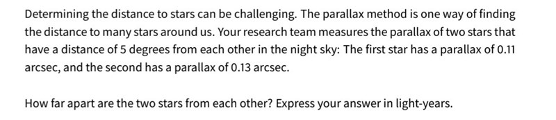 Parallax of two stars are given along with their angular separation. Find the distance between them