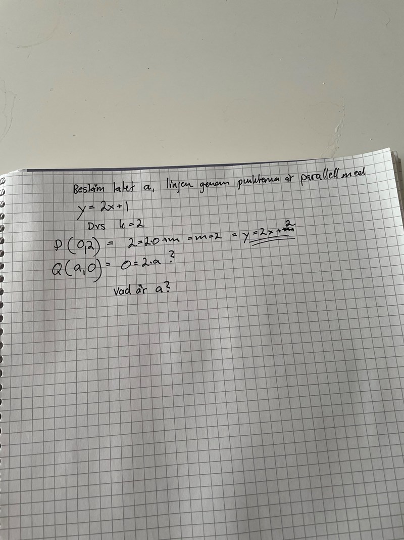 beerger skrev:Smaragdalena skrev:Alternativt kan du först räkna ut m-värdet för linjen genom P och därefter lösa ekvationen 0 = 2.0+m där du använder ditt framräknade m.