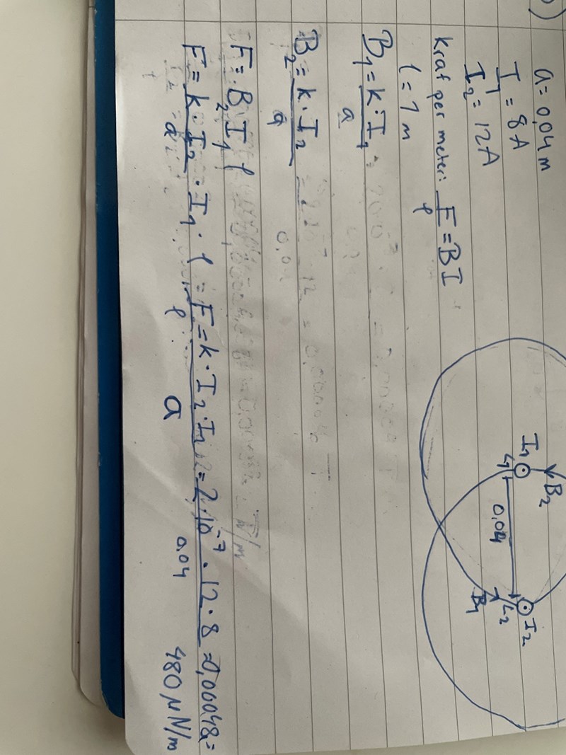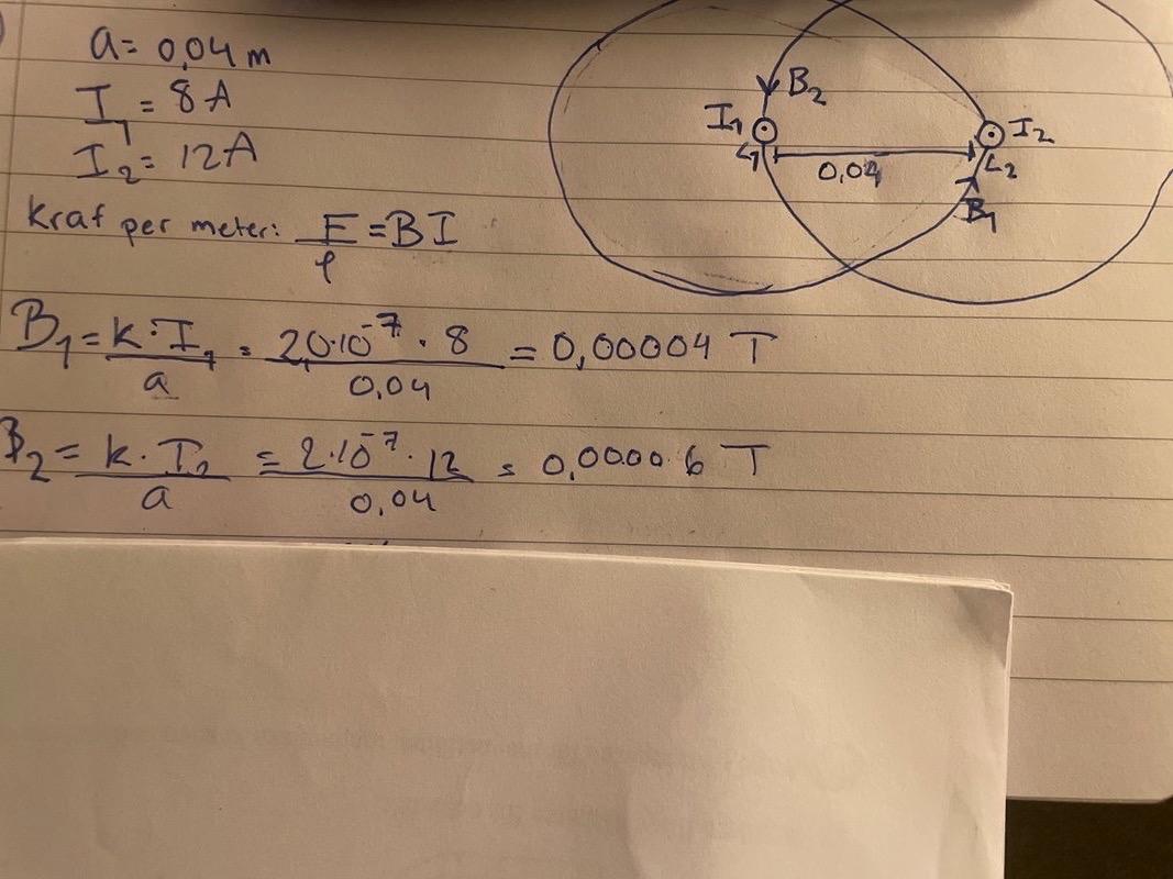 Fråga: Två parallella ledare är 4 cm ifrån varandra. I den ena ledaren är strömmen 8 A och i den andra 12A.