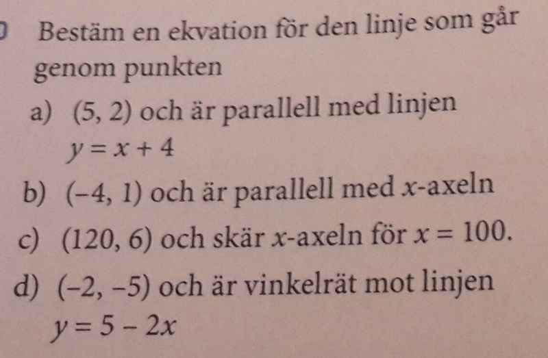 smaragdalena skrev :Du vet två punkter på linjen - (-4,1) och (100,0). Kan du lösa den då?