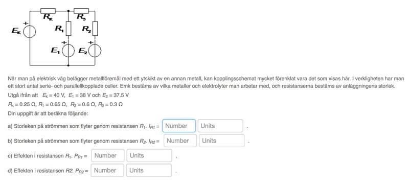 Har stora problem med denna uppgiftstypen. Jag hittar ingen formel som beskriver hur jag ska förhålla mig till spänningskällorna. I detta fall tror jag det främst är Ek och Rk som rör till det för mig.. Någon som kan förklara hur jag ska tänka?