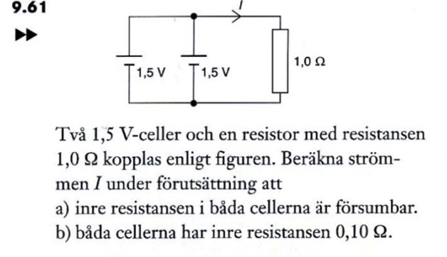 Annars kan man använda att spänningsfallet kring en slinga ska vara 0 (Kirchoffs spänningslag) och se att man både kan gå den yttre slingan över motståndet och spänningskällan till vänster eller den inre slingan från motståndet till spänningskällan till höger.