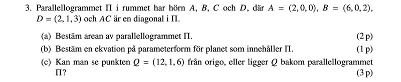 Laguna skrev:Om du drar en linje genom origo och (12, 1, 6), kommer den att skära parallellogrammet eller inte?