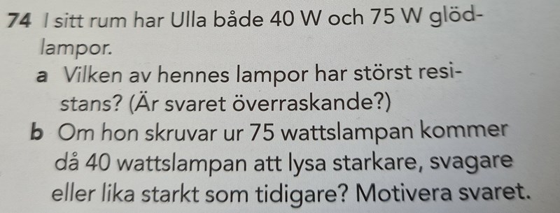 Jobbar med 74 b) och har en fråga relaterad till denna. Jag vet att två seriekopplade lampor lyser svagare än två parallellt kopplade, men varför då?