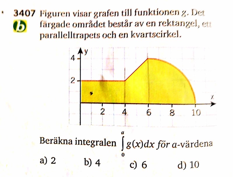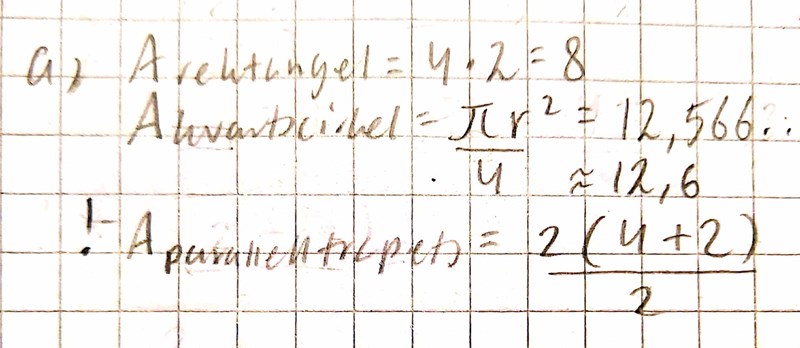 Jag har räknat ut arean av rektangeln och kvartscirkeln, och skrivit upp hur jag hade funnit arean hos paralleltrapetsen vanligtvis. Nu är jag inte säker på om det enda jag behöver göra är att byta ut 4 mot 2 (i deluppgift a) och sedan addera svaret med resten av resultaten, eller om jag har tänkt fel kring paralleltrapetsens uträkning: