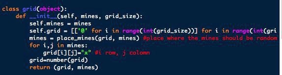 Konstruktören i python kallas för __innit__ för initialize. De formella parametrarna för denna funktion är mines, grid_size och self.