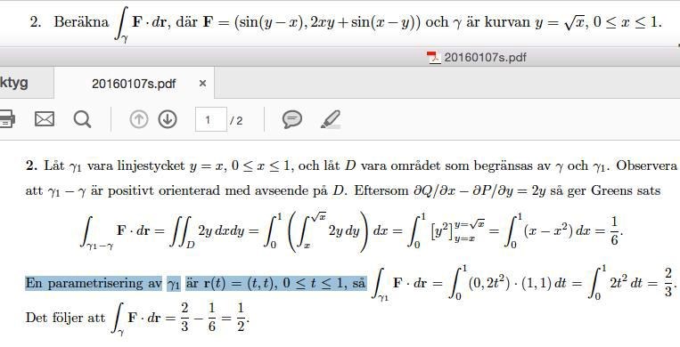 där är en parametrisering av kurvan. Parametriseringar är alltså egentligen det "vanliga" sättet att beräkna en kurvintegral på. Allt det här med Greens formel och Stokes sats är sätt att beräkna kurvintegraler under vissa specifika förutsättningar, men parametriseringsmetoden kan (nästan) alltid användas.
