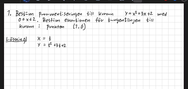 Förstår inte risktagande hur jag ska hitta tangentlinjen i punkten (1,6)? Ska jag derivera y och x för sig? Någon som har en idé? :)