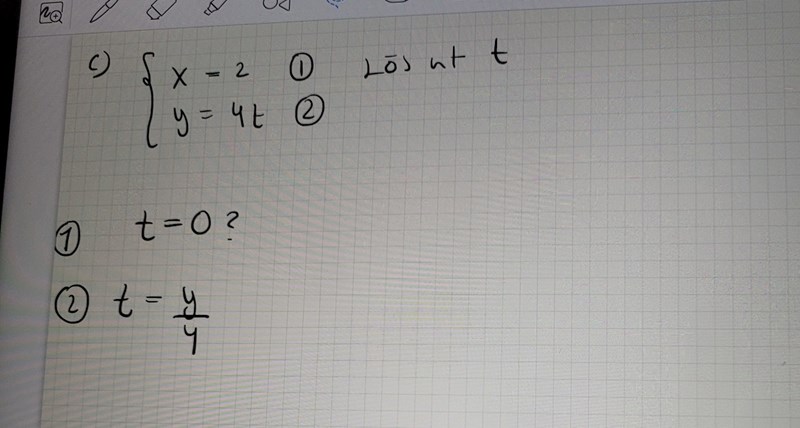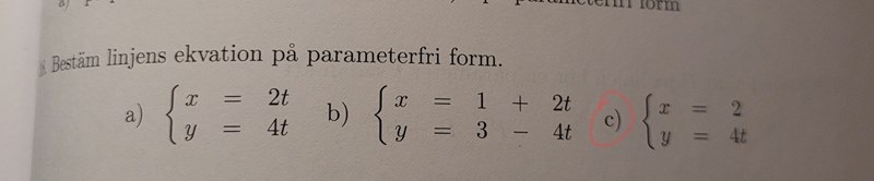 Så meningen är att jag ska lösa ur t i (1) och (2) och sedan sätta de likamed varandra, men problemet är att det finns inget t i (1). Vad händer då?