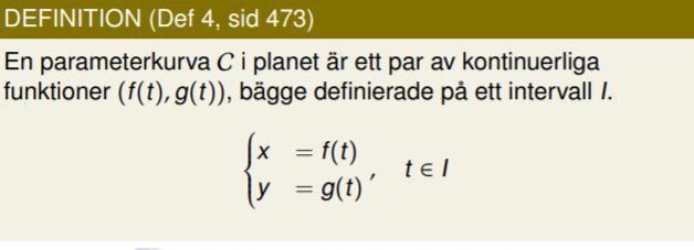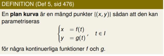 Skillnaden i definitionerna är att en plan kurva är en punktmängd (som _kan_ parametriseras enligt uttrycket), medan en parameterkurva i planet är själva funktionsparet. Jag tror att jag tidigare alltid sett kurvor definieras som punktmängder, men inte här, alltså.