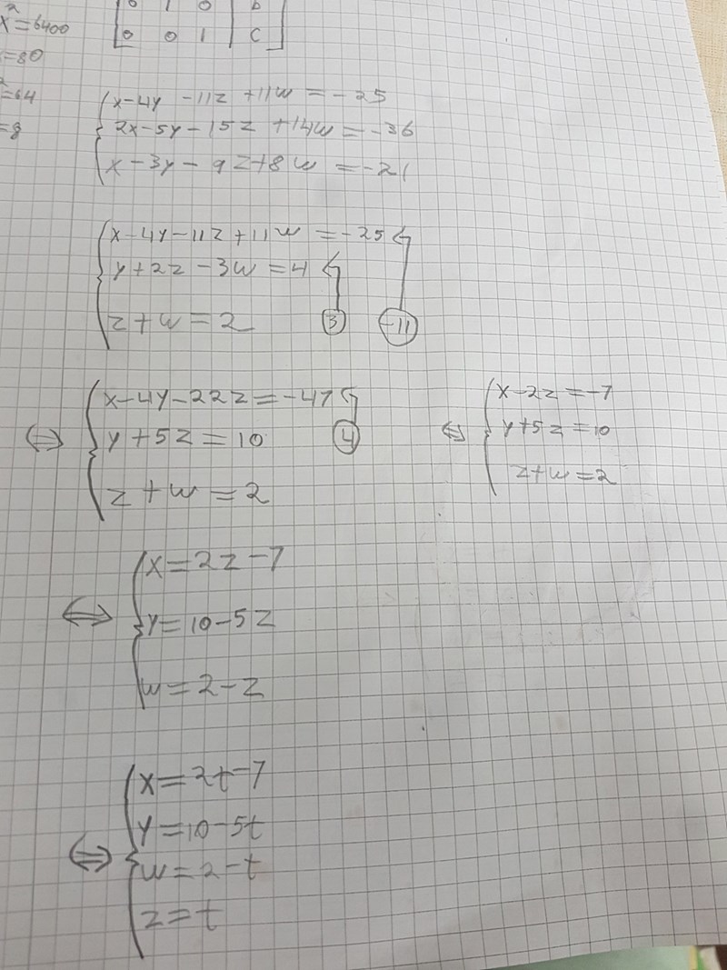 Om du sätter t=0t=0 i facits lösningsmängd får du punkten (x,y,z,w)=(-3,0,2,0)(x,y,z,w)=(-3,0,2,0), vilket motsvarar t=2t=2 i ditt system. Testa får du se!