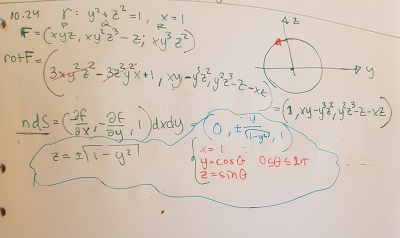 Jag tror det skulle vara enklare att parametrisera cirkeln, men om jag gör det fattar jag inte hur jag ska räkna ut ndS eftersom den då enbart kommer bero på täta 🤦‍♀️ jag har verkligen inte hajjat detta kapitlet, så jag försöker göra så många uppg jag hinner innan tentan nästa vecka och jag skulle bara vilja fatta, men gör inte. Der som ät inringat i blott dilemat jag hamnar i om jag inte parametriserar och det som är i rött är så jaf skulle vilja parametrisera.