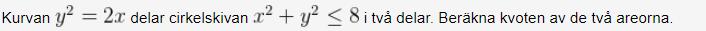 Bubo skrev:Det lilla sökta området har tre delar. En kvartscirkel och två små bitar. En sådan bit begränsas av y=x och y =sqrt(2x )