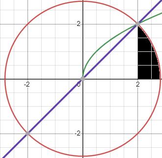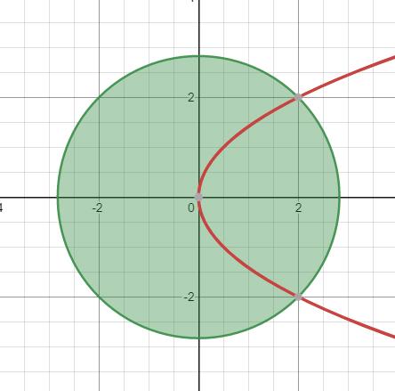 Jag tror att jag har hittat skärningspunkterna som jag fick när jag satte in kurvan i cirkelskivan, fick då att x är -4 eller 2. Men då kurvan går åt höger (kan man säga så?) är det när x är lika med 2 som gäller.