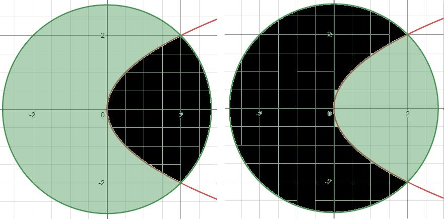 Nu kan du väl ta bara 1/2 av cirkeln ... beräkna halvcirkelns area och den övre delen (y>=0) av den vänstra svarta arean (inom parabeln, som består av 2 delar).