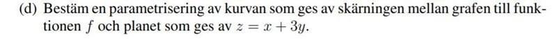 då har jag x(t) = rcost, y(t) = sint och z(t) får jag från z=x+3y = rcost + 3rsint