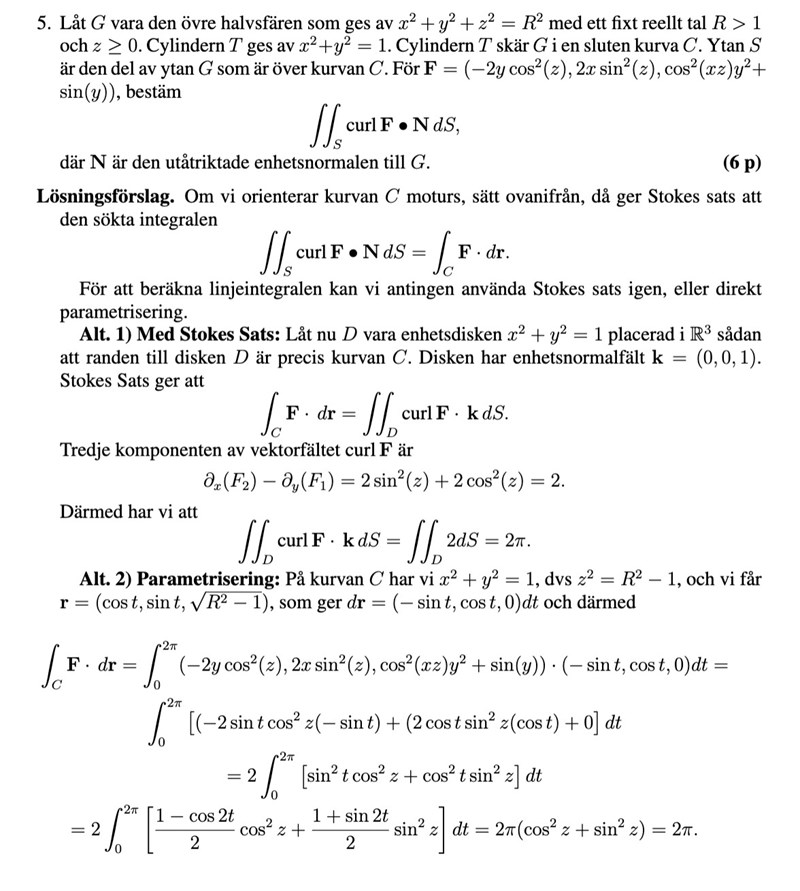 På alt 2 Parametrisering: ska inte z= R2-1? Varför skriver de då z=z i integralen? Dessutom, hur vet man hur man ska öndra sin2t till 1-cos2t2 och inte tex 1-cos2 eller något annat?