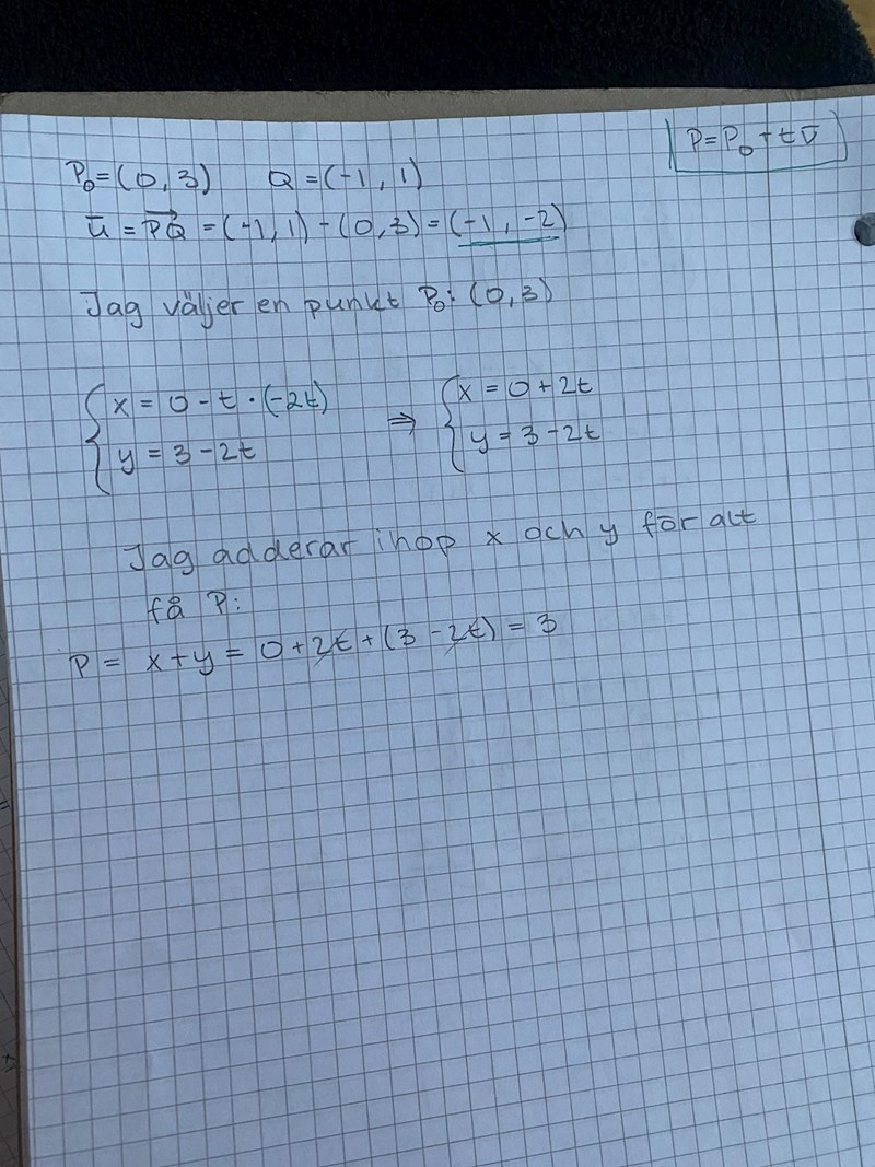 Jag har börjat med den och jag har fått ut den i parameterform. Jag har även lyckats få ut P (C). Jag vet inte hur jag ska ut värdena A och B så att jag kan få den på formen Ax+By=C. Just nu har jag bara fått ut Ax+By=3.