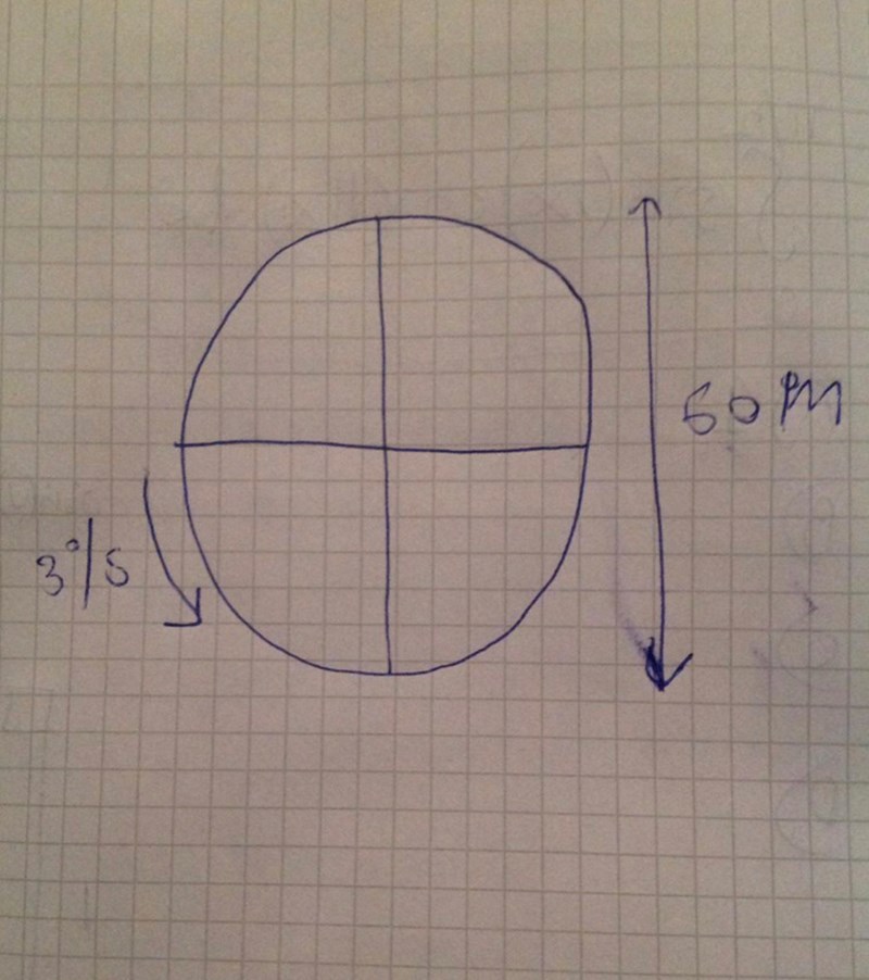 Ett parisehjul är 60meter högt och roterar med hastigheter 3grader/sekund. Det kliver in personer när gondolen är mitt under hjulet. Efter hur lång tid befinner sig hjulet 50meter upp?