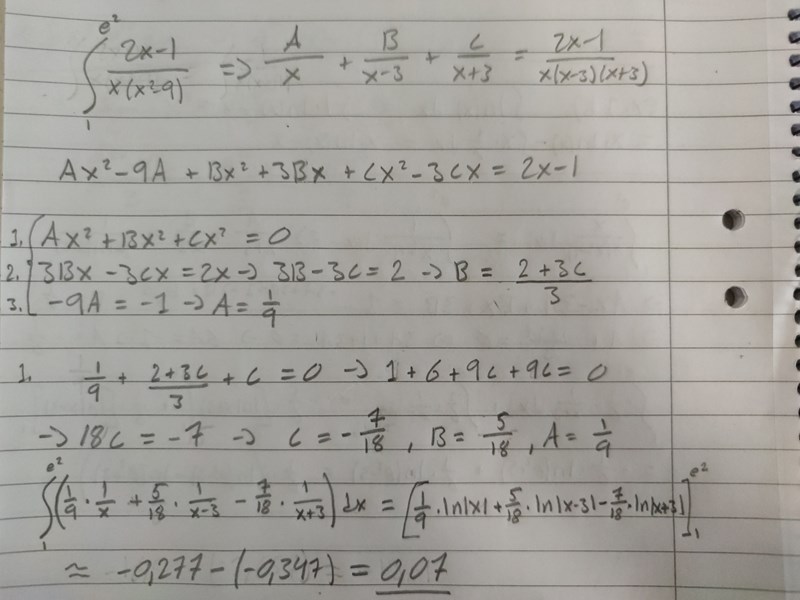 Jag skulle behöva lite hjälp att ta mig vidare med följande uppgift. Jag har börjat lite och vet hur jag beräknar första integralen i sista steget, men hur gör jag med den andra integralen? Kan jag köra partialbråksuppdelning igen på den? Då skulle kan kunna ha ansatsen (Ax+B)/(x+3) + (c)/(x-3) = (-(1/9)x+2)/(x^2 - 9=