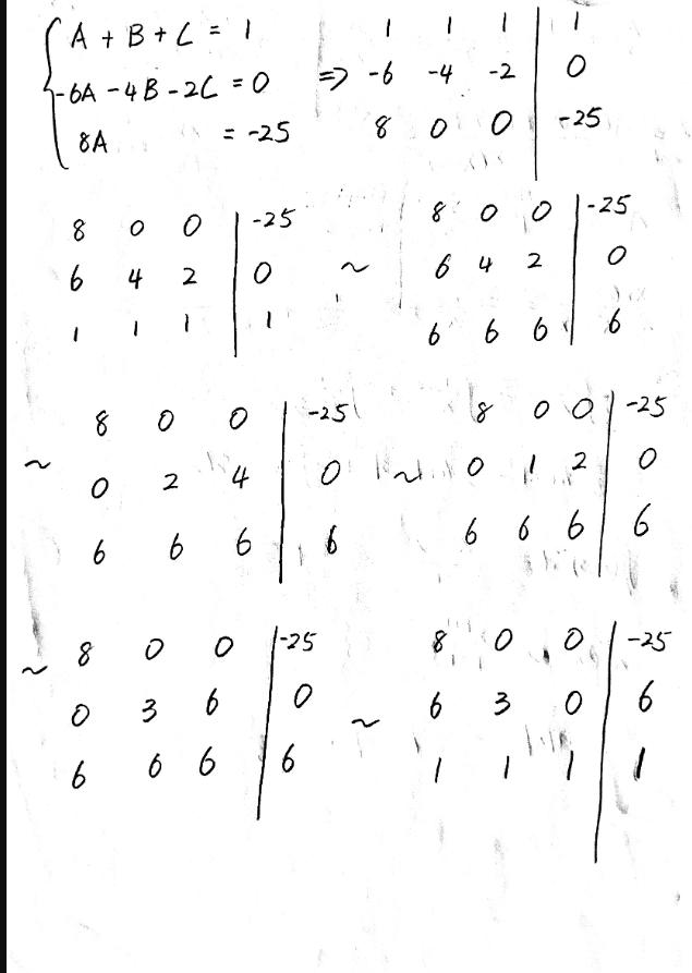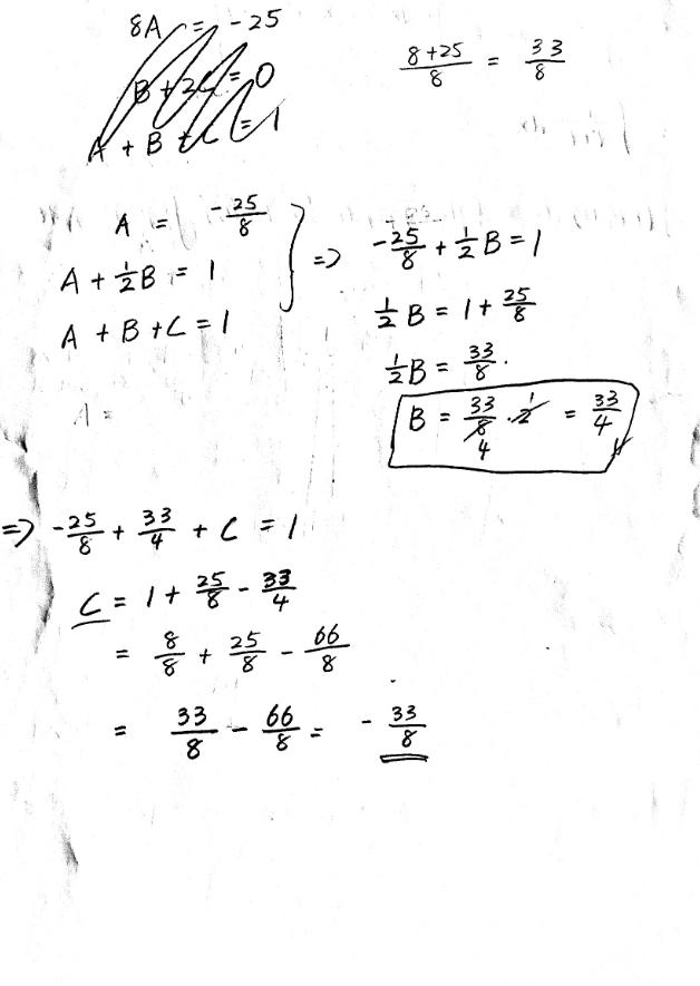 Tekniken är rätt, men det blir ett slarvfel på vägen. Tänk på att , inte +25. I övrigt ser beräkningarna korrekta ut, så om du bara korrigerar värdet på A, och tar fram de nya värdena på B och C, så är du färdig sedan. :)