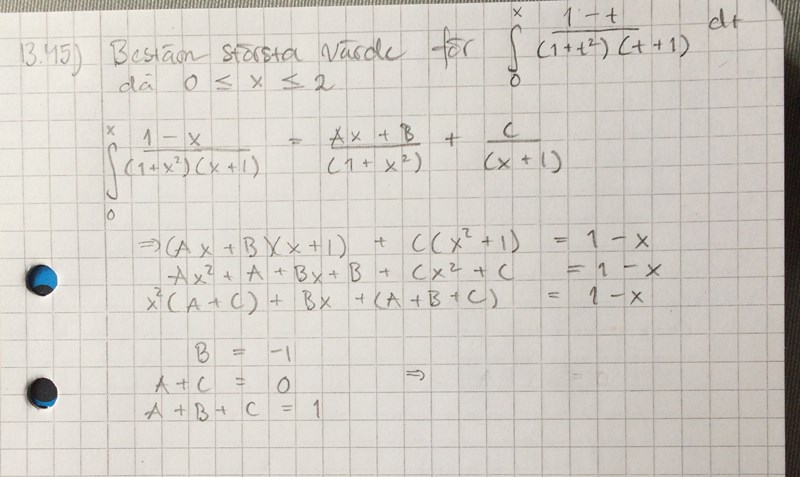 Hej! Jag försöker att integrera men fastnar på partialbråkuppdelningen. Mitt ekvationssystem leder till att det finns fria variabler, vilket inte kan stämma. Vad gör jag för fel?