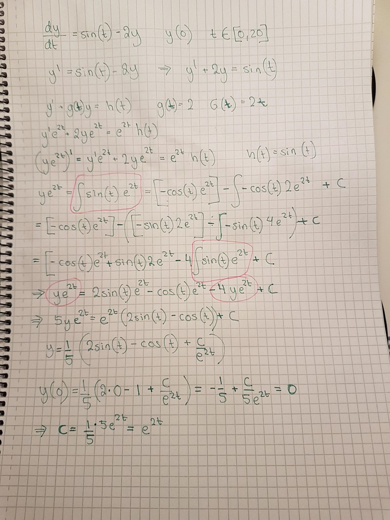 y(t)=1/5(e^(-2t)+2sin(t)-cos(t))