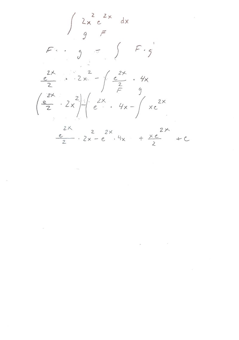 Okej. Första steget ser rätt ut. Däremot ser du ut att göra flera fel i andra steget: du har tappat en division med 2 (det står bara e^(2x)), du integrerar inte e^(2x)/2, och du har glömt att derivera.