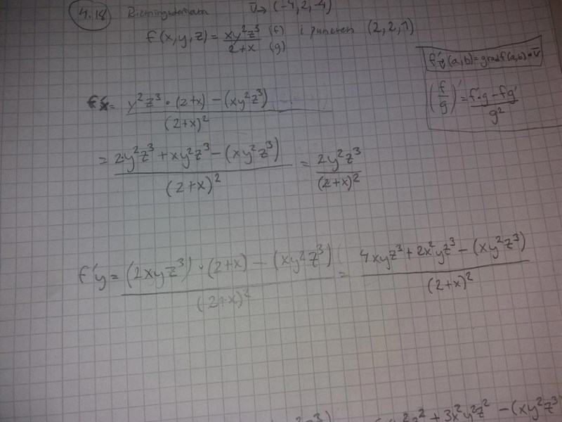 Som ni ser har jag använt kvotregeln och tror jag gjort rätt på f'x men får inte till f'y. Svaren i facit står (y^2z^3/x+2 - xy^2z^3/(2+x)^2 , 2xyz^3/2+x , 3xy^2z^2/2+x). Om svaret i facit följer (f'x,f'y,f'z) har jag fått fel på f'x ser jag nu. Men fattar inte vad jag gjort för fel?