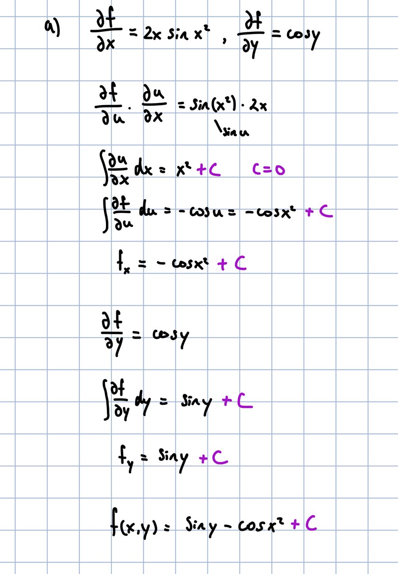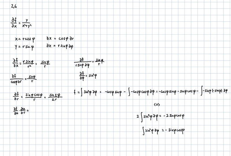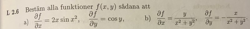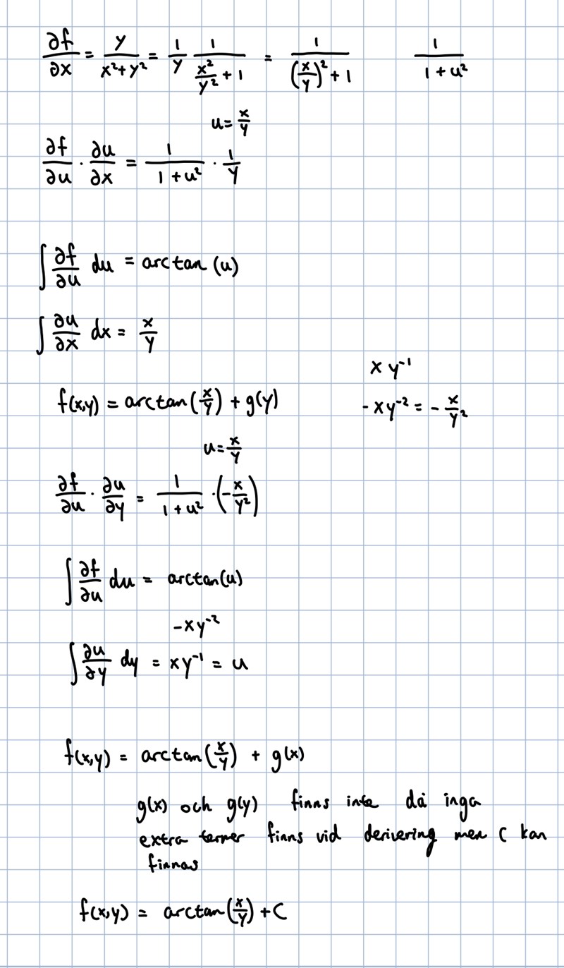 Ah, jag vet inte hur man löser uppgiften på ett bra sätt så jag tänkte att man kunde integrera det andra uttrycket också för att få f(x,y) och försöker visa att man kommer fram till arctan(x/y) från båda villkoren. Men om jag har förstått dig rätt så kan man istället derivera uttrycket vi får från som är arctan(x/y) + g(y) och derivera med avseende på y och får + g´(y) och sedan jämföra med villkoret vi får och säger att g(y) kan endast vara em konstant C?