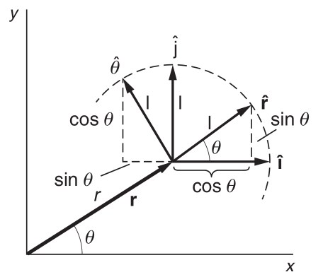 Vi lägger in två vinkelräta basvektorer av enhetslängd, och i punkten (se bild). Det är viktigt att inse att basvektorerna pekar i olika riktningar i olika punkter, men de är alltid vinkelräta mot varandra. Enkel komposantuppdelning ger oss komponenterna i x- och y-led.