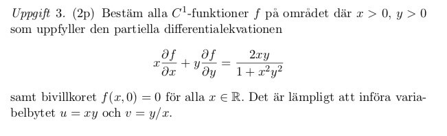 Jag började med att genomföra ett variabelbyte till u och v med hjälp av kedjeregeln och när jag satte in dessa i originalfunktionen fick jag fram att , men nu vet jag inte hur jag ska fortsätta med denna: ska jag lösa detta mha den integrerande faktorn eller helt enkelt lösa den genom att integrera m.a.p. u?