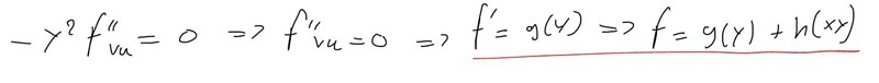 Om ekvationen du kommit fram till var , då har man alltså deriverat funktionen med avseende på v, och fått noll. Vilka sorters funktioner deriveras till noll, om v är variabeln? Jo, funktioner som inte använder v. Dvs, konstanter, eller mer generellt: funktioner av u (en konstant funktion kan också sägas vara en funktion av u). Så: .