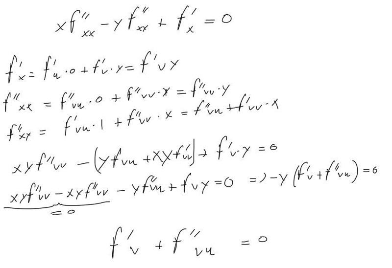 Sen försöker vi backa ett steg till. En funktion har deriverats med avseende på v, och blivit g(u). Hur kan den ursprungliga funktionen sett ut? Jo, eftersom v är variabeln, fungerar g(u) som en konstant. Eftersom den kvarstår efter derivering, måste det varit en koefficient till v. Dessutom kan det funnits en annan funktion av u, som försvann i deriveringen. Så: (kontrollderivera gärna). Så, i det fallet borde du få f(x,y) = xy*g(y) + h(y), om jag inte tänker fel.