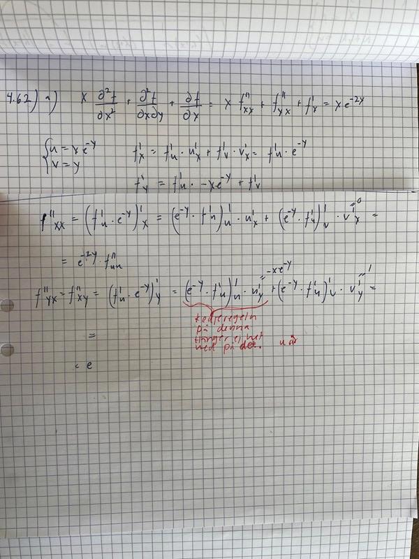 Jag har kört fast på det rödmarkerade i uppgiften. Jag tänker att jag ska använda kedjeregeln när jag deriverar med hänseende på u. Men jag vet inte hur jag ska derivera e^(-y)? Hur ska jag tänka?