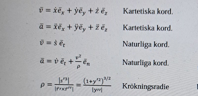 Jag vet att det finns denna formel för krökningsradie som förekommer både i accelerationen men sen vet jag inte vilken av dem jag ska använda samt hur jag ska börja.Misstänker att vi ska använda naturliga koordinater för att lösa ut sökta rho, men hur tar jag reda på et samt en då?