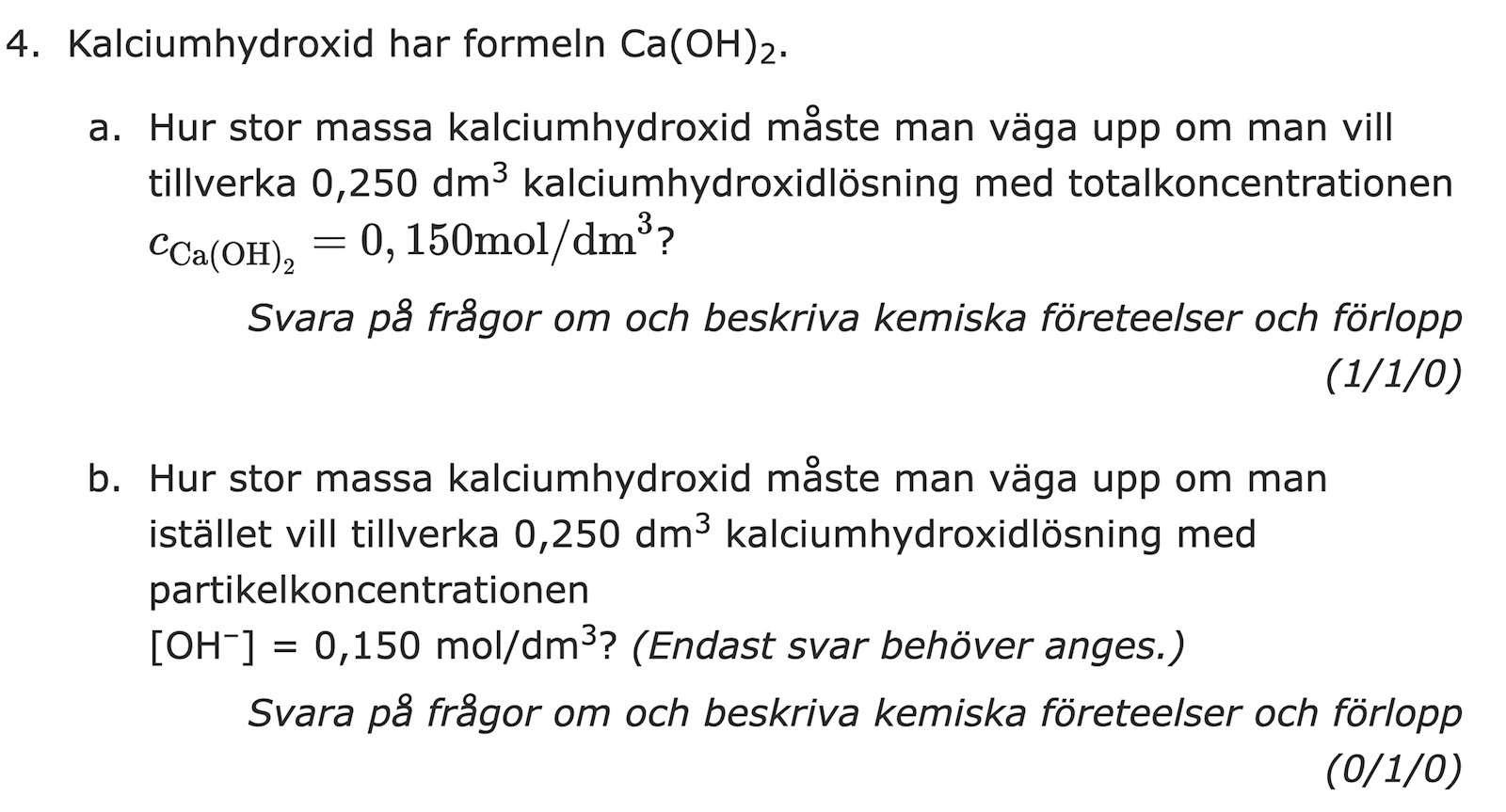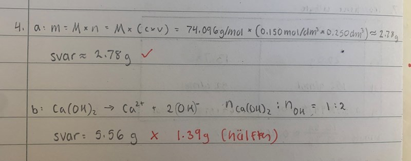 På a) har jag rätt, men på b) har jag fel. Jag förstår inte varför svaret ska vara 1.39 g. Jag tänkte att förhållandet mellan Ca(OH)2 och OH är 1:2, och därför ska jag ta massan (som jag räknade i a) gånger 2.