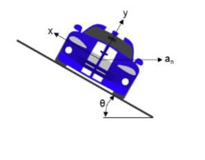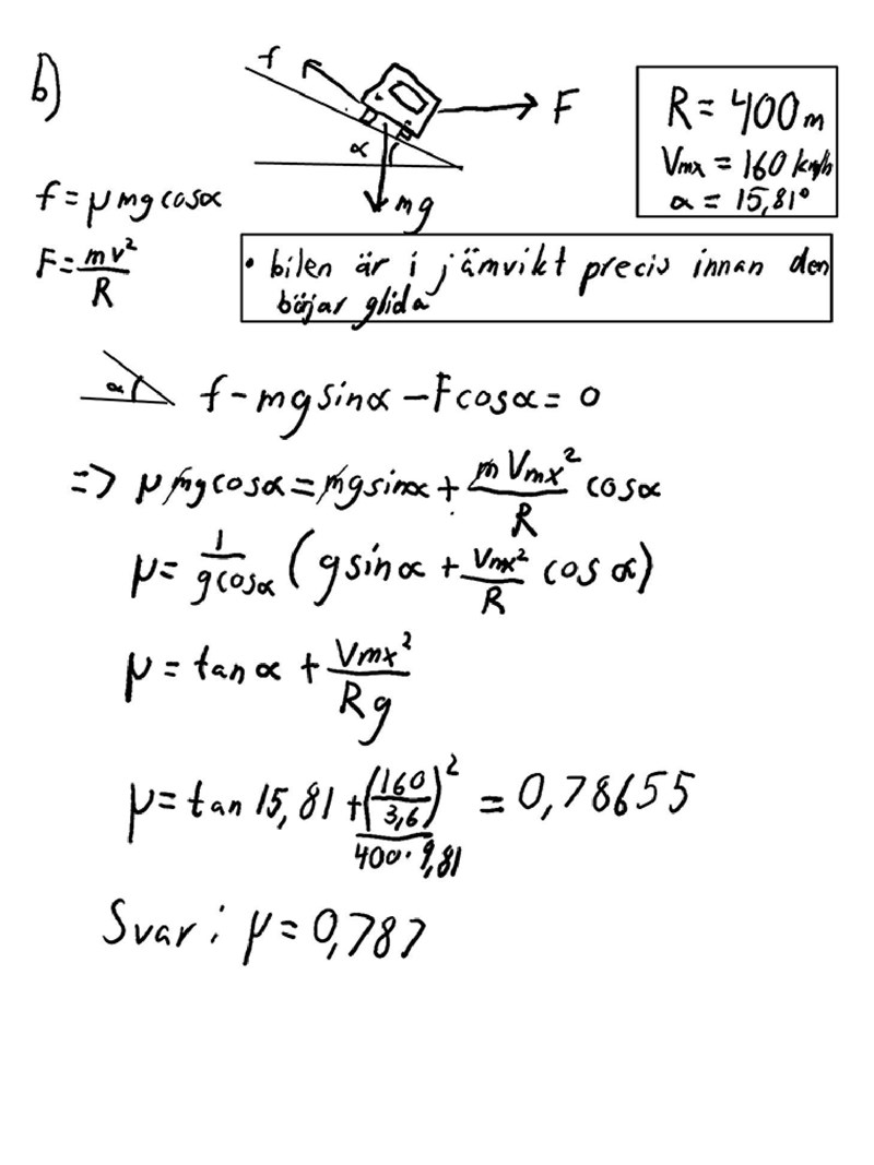 Om bilen istället kör igenom kurvan med hastigheten Vmx ligger den på gränsen att börja glida uppför lutningen (positiv x-led). Bilen kan, för enkelhets skull, betraktas som en partikel.