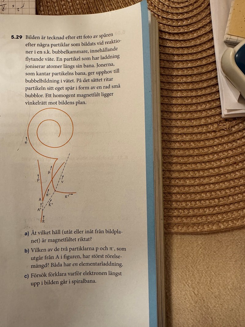 Uppgift a så förstod jag att pågrund av att spiralen går inåt så måste en kraft vara riktad åt höger och i och med att strömmen går motsatt elektronens riktning så fick jag fram att magnetfältet är riktat inåt (högerhandsregel)
