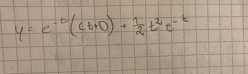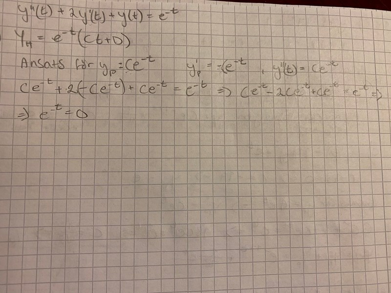 jag ska lösa differentialekvationen som står högst upp på bilden. Förstår inte hur jag ska få till partikulär lösningen. Något blir fel, då facit har skrivit detta som svar